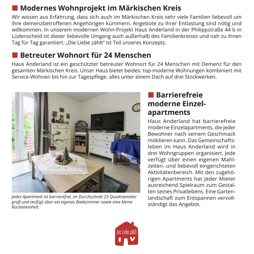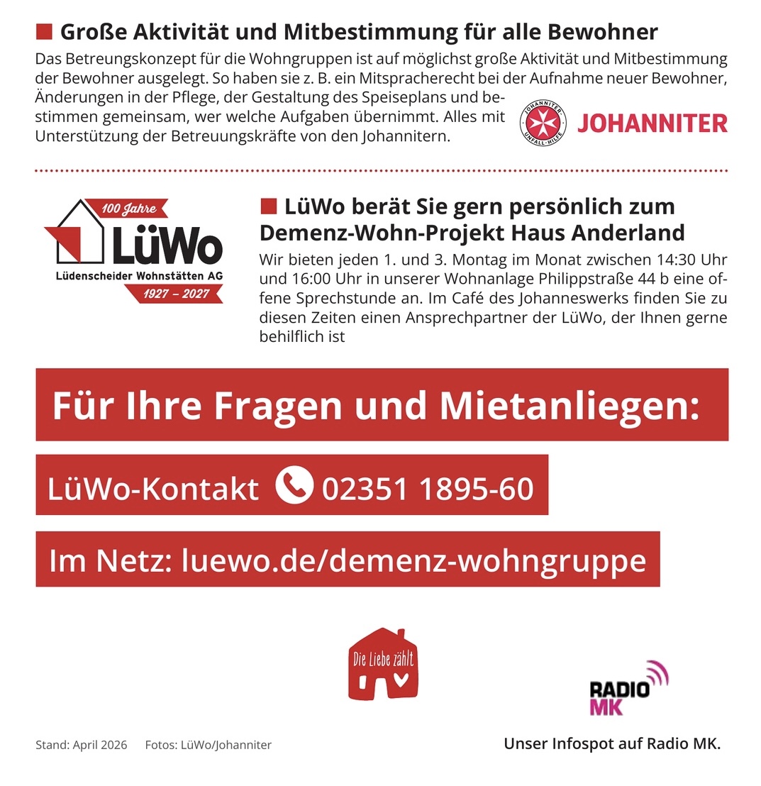 Genau deshalb lohnt sich unser Newsletter: Er informiert Sie über ein wichtigen Thema, wie unser Wohn-Projekt für Menschen mit Demenz im Märkischen Kreis.